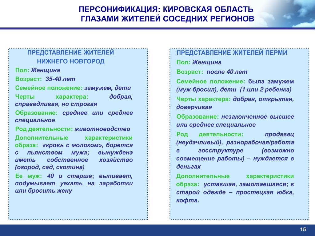 ПЕРСОНИФИКАЦИЯ: КИРОВСКАЯ ОБЛАСТЬ ГЛАЗАМИ ЖИТЕЛЕЙ СОСЕДНИХ РЕГИОНОВ • ПРЕДСТАВЛЕНИЕ ЖИТЕЛЕЙ • НИЖНЕГО НОВГОРОД • Пол:Женщина • Возраст:35-40 лет • Семейное положение:замужем, дети • Черты характера:добрая, справедливая, но строгая • Образование:среднее или среднее специальное • Род деятельности:животноводство • Дополнительные характеристики образа: «кровь с молоком», борется с пьянством мужа; вынуждена иметь собственное хозяйство (огород, сад, скотина) • Ее муж:40 и старше; выпивает, подумывает уехать на заработки или бросить жену • ПРЕДСТАВЛЕНИЕ ЖИТЕЛЕЙПЕРМИ • Пол:Женщина • Возраст:после 40 лет • Семейное положение: была замужем (муж бросил), дети (1 или 2 ребенка) • Черты характера:добрая, открытая, доверчивая • Образование:незаконченное высшее или среднее специальное • Род деятельности: продавец (неудачливый), разнорабочая/работа в госструктуре (возможно совмещение работы) – нуждается в деньгах • Дополнительные характеристики образа: уставшая, замотавшаяся; в старой одежде – простецкая юбка, кофта. 15