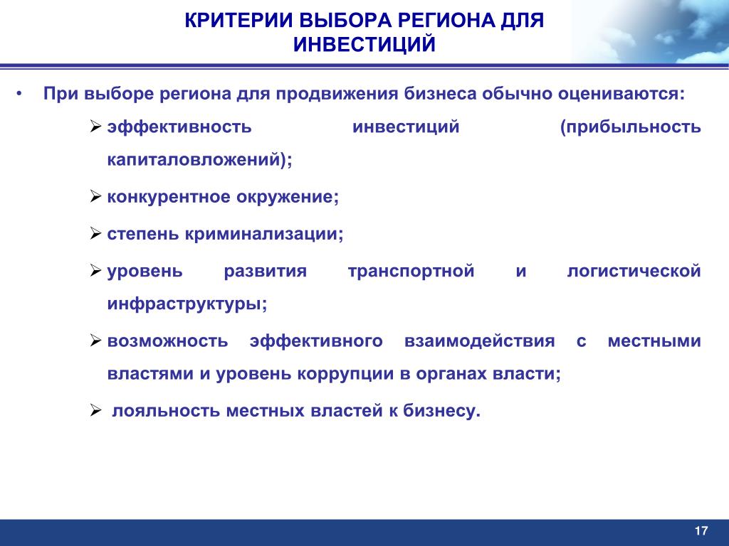 КРИТЕРИИ ВЫБОРА РЕГИОНА ДЛЯ ИНВЕСТИЦИЙ При выборе региона для продвижения бизнеса обычно оцениваются: эффективность инвестиций (прибыльность капиталовложений); конкурентное окружение; степень криминализации; уровень развития транспортной и логистической инфраструктуры; возможность эффективного взаимодействия с местными властями и уровень коррупции в органах власти; лояльность местных властей к бизнесу. 17