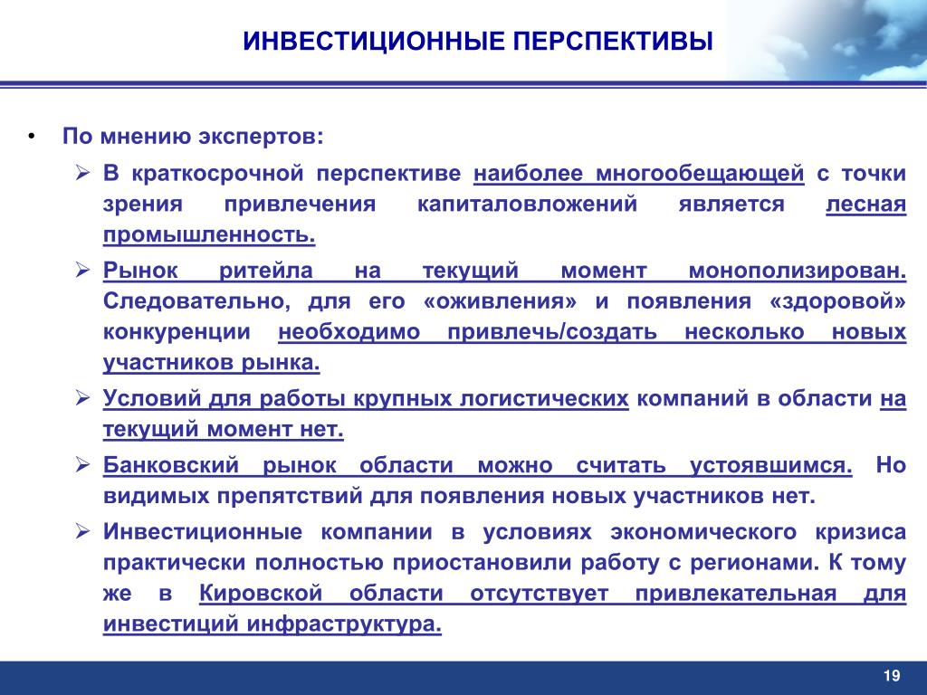 ИНВЕСТИЦИОННЫЕ ПЕРСПЕКТИВЫ • По мнению экспертов: • В краткосрочной перспективе наиболее многообещающей с точки зрения привлечения капиталовложений является лесная промышленность. • Рынок ритейла на текущий момент монополизирован. Следовательно, для его «оживления» и появления «здоровой» конкуренции необходимо привлечь/создать несколько новых участников рынка. • Условий для работы крупных логистических компаний в области на текущий момент нет. • Банковский рынок области можно считать устоявшимся. Но видимых препятствий для появления новых участников нет. • Инвестиционные компании в условиях экономического кризиса практически полностью приостановили работу с регионами. К тому же в Кировской области отсутствует привлекательная для инвестиций инфраструктура. 19