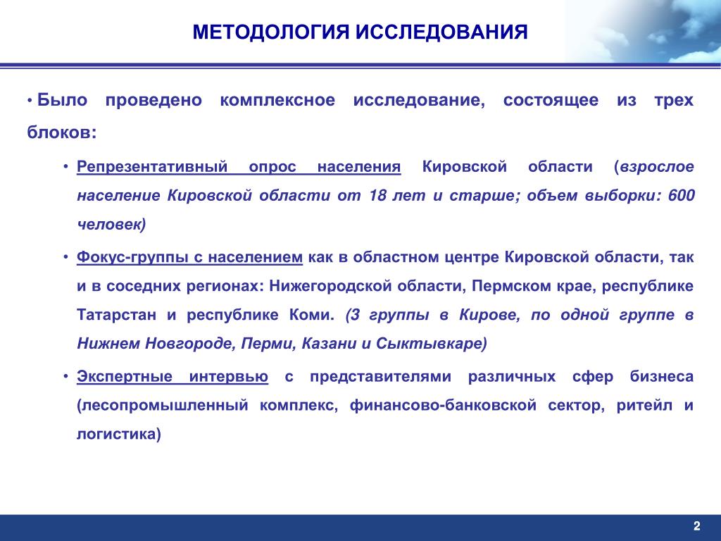 «Социально-экономическая ситуация в Кировской области» ПРЕЗЕНТАЦИЯ. сентябрь 2009. МЕТОДОЛОГИЯ ИССЛЕДОВАНИЯ. Было проведено комплексное исследование, состоящее из трех блоков: