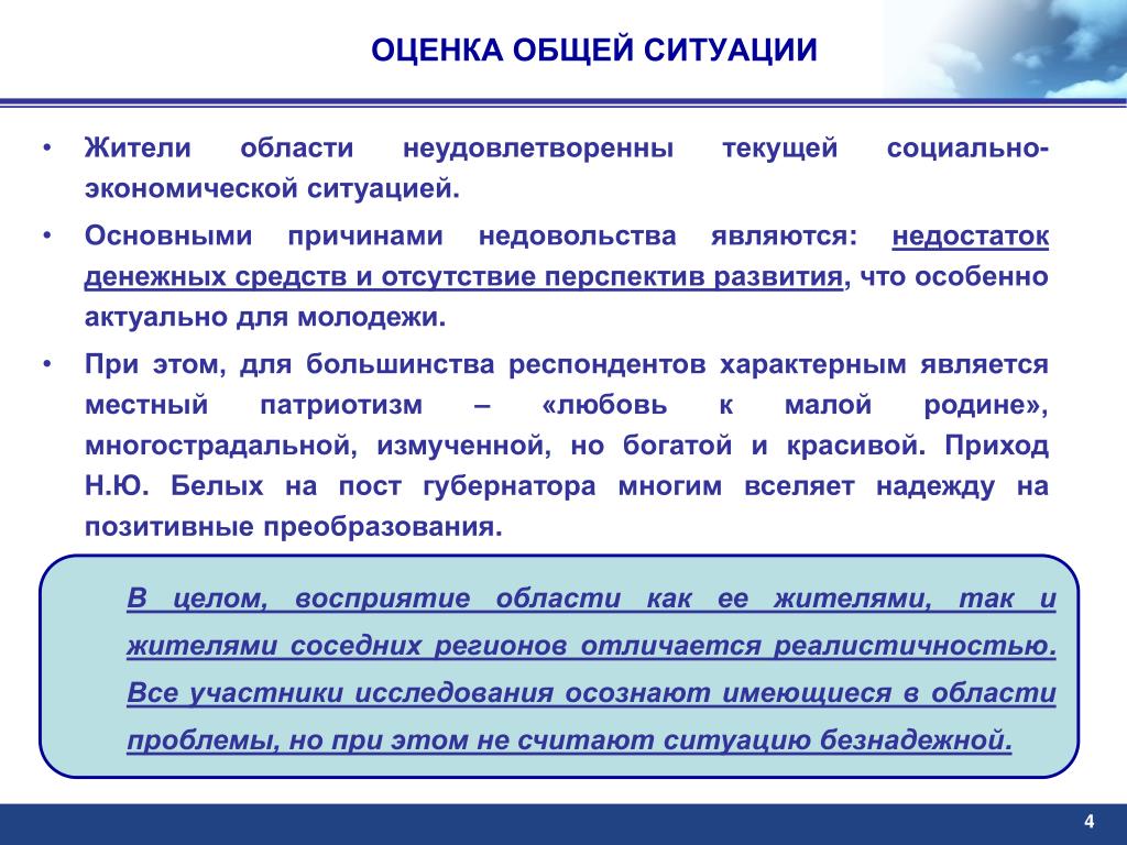 ОЦЕНКА ОБЩЕЙ СИТУАЦИИ • Жители области неудовлетворенны текущей социально-экономической ситуацией. • Основными причинами недовольства являются: недостаток денежных средств и отсутствие перспектив развития, что особенно актуально для молодежи. • При этом, для большинства респондентов характерным является местный патриотизм – «любовь к малой родине», многострадальной, измученной, но богатой и красивой. Приход Н.Ю. Белых на пост губернатора многим вселяет надежду на позитивные преобразования. • В целом, восприятие области как ее жителями, так и жителями соседних регионов отличается реалистичностью. Все участники исследования осознают имеющиеся в области проблемы, но при этом не считают ситуацию безнадежной. 4