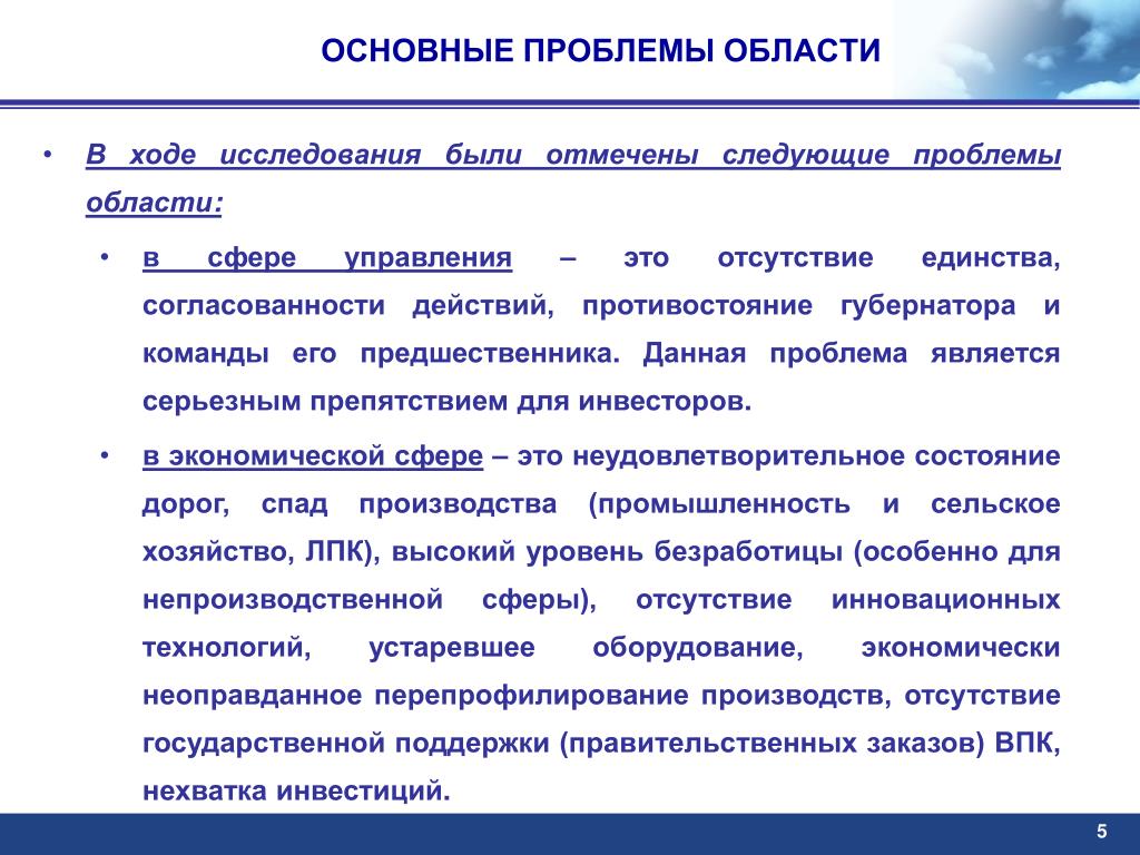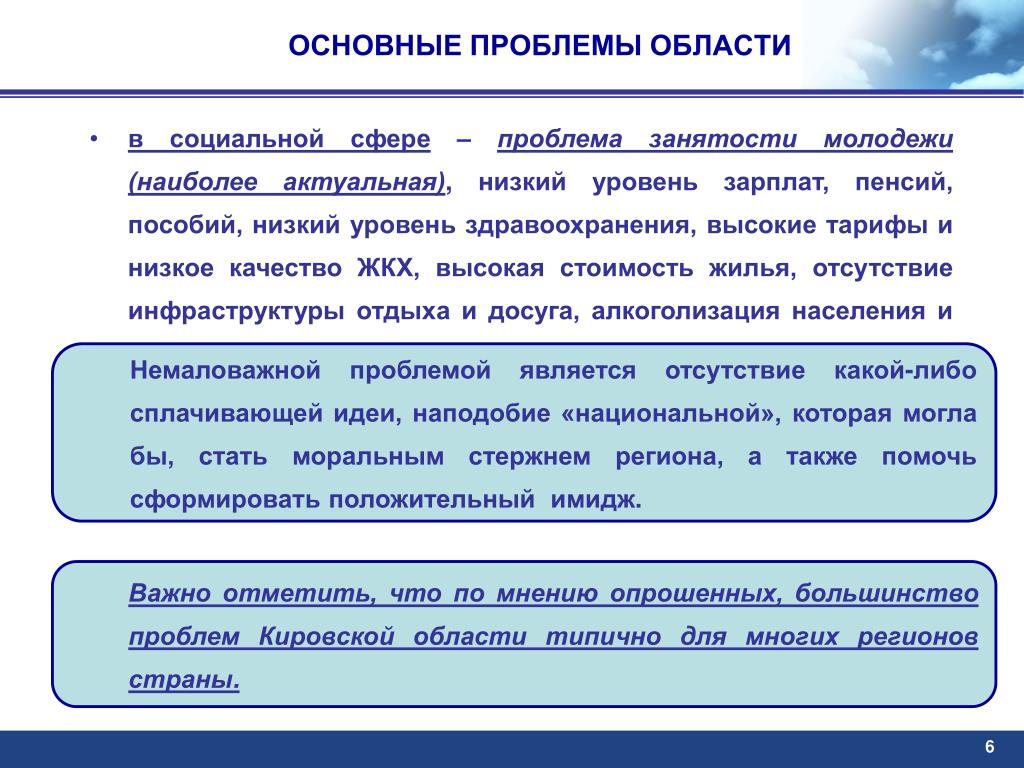 ОСНОВНЫЕ ПРОБЛЕМЫ ОБЛАСТИ • В ходе исследования были отмечены следующие проблемы области: • в сфере управления – это отсутствие единства, согласованности действий, противостояние губернатора и команды его предшественника. Данная проблема является серьезным препятствием для инвесторов. • в экономической сфере – это неудовлетворительное состояние дорог, спад производства (промышленность и сельское хозяйство, ЛПК), высокий уровень безработицы (особенно для непроизводственной сферы), отсутствие инновационных технологий, устаревшее оборудование, экономически неоправданное перепрофилирование производств, отсутствие государственной поддержки (правительственных заказов) ВПК, нехватка инвестиций. 5