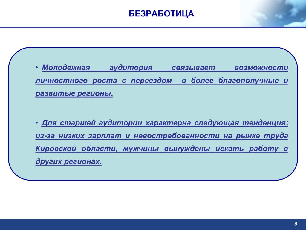 БЕЗРАБОТИЦА • Молодежная аудитория связывает возможности личностного роста с переездом в более благополучные и развитые регионы. • Для старшей аудитории характерна следующая тенденция: из-за низких зарплат и невостребованности на рынке труда Кировской области, мужчины вынуждены искать работу в других регионах. 8