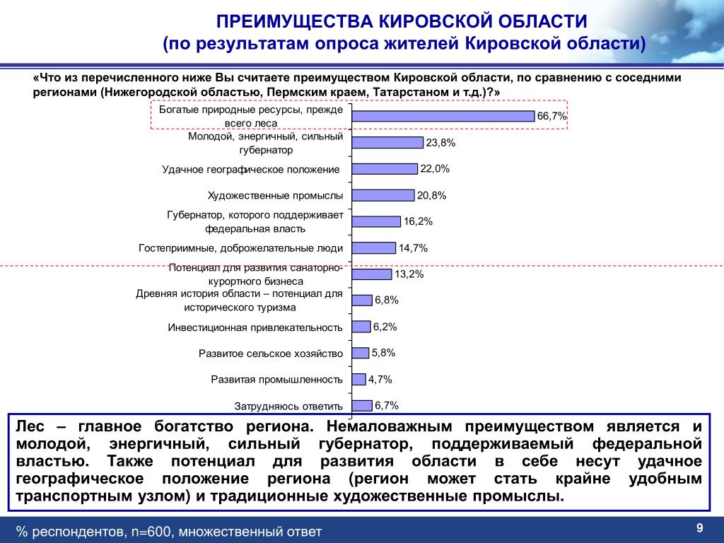 ПРЕИМУЩЕСТВА КИРОВСКОЙ ОБЛАСТИ (по результатам опроса жителей Кировской области) «Что из перечисленного ниже Вы считаете преимуществом Кировской области, по сравнению с соседними регионами (Нижегородской областью, Пермским краем, Татарстаном и т.д.)?» Лес – главное богатство региона. Немаловажным преимуществом является и молодой, энергичный, сильный губернатор, поддерживаемый федеральной властью. Также потенциал для развития области в себе несут удачное географическое положение региона (регион может стать крайне удобным транспортным узлом) и традиционные художественные промыслы. 9 % респондентов, n=600, множественный ответ