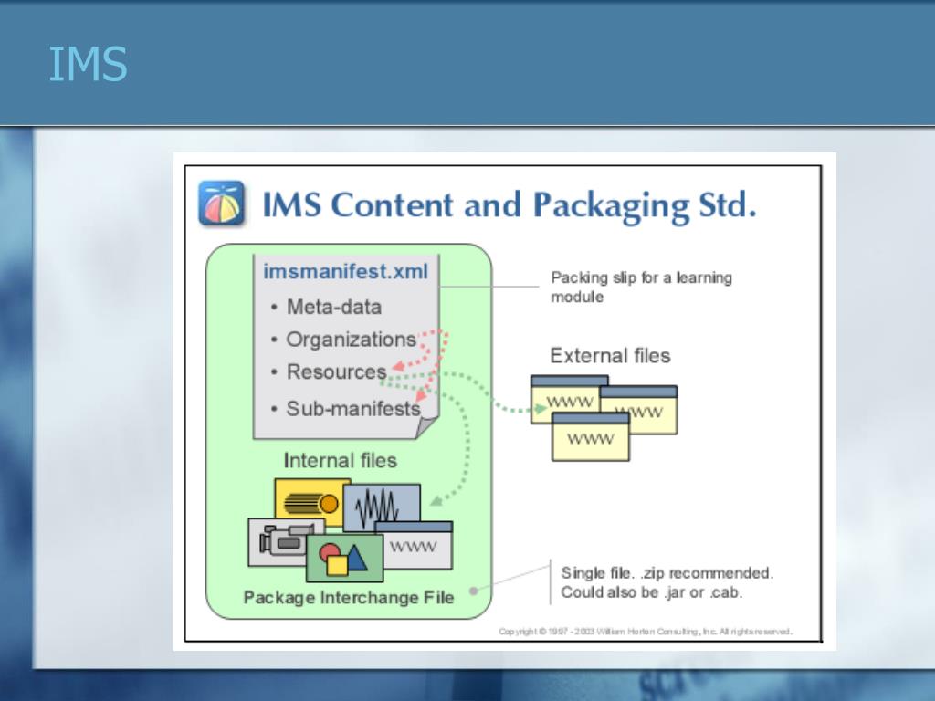 IMS (Instructional Management System) Global Learning Consortium • The IMS (Instructional Management System) Global Learning Consortium is developing and promoting open specifications (no standards) for facilitating online distributed learning activities such as locating and using educational content, tracking learner progress, reporting learner performance, and exchanging student records between administrative systems. • IMS has two key goals: • defining the technical standards for interoperability of applications and services in distributed learning • supporting the incorporation of IMS specifications into products and services worldwide. IMS promotes widespread adoption of specifications that will allow distributed learning environments and content from multiple authors to work together.