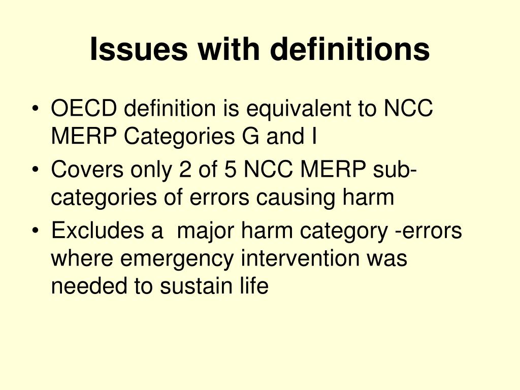 Issues with definitions • OECD definition is equivalent to NCC MERP Categories G and I • Covers only 2 of 5 NCC MERP sub-categories of errors causing harm • Excludes a major harm category -errors where emergency intervention was needed to sustain life