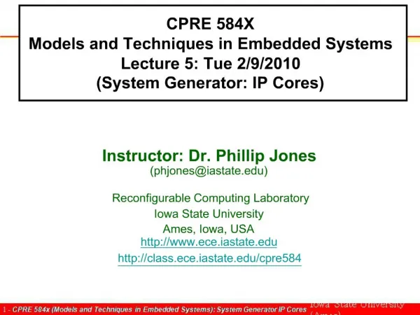Class wiki!!: http://localhost/testwiki/Note: must login to xilinx.ece.iastate.edu to accessTeams Present weeks work on System Generator, and class feedback.High-level intro to FPGAs abbreviated week one CPRE 583IP Core integration from System Generator. Overview. Help share discoveries, and solutions with the rest of the class, and future classesYou can (and are encouraged to) edit.