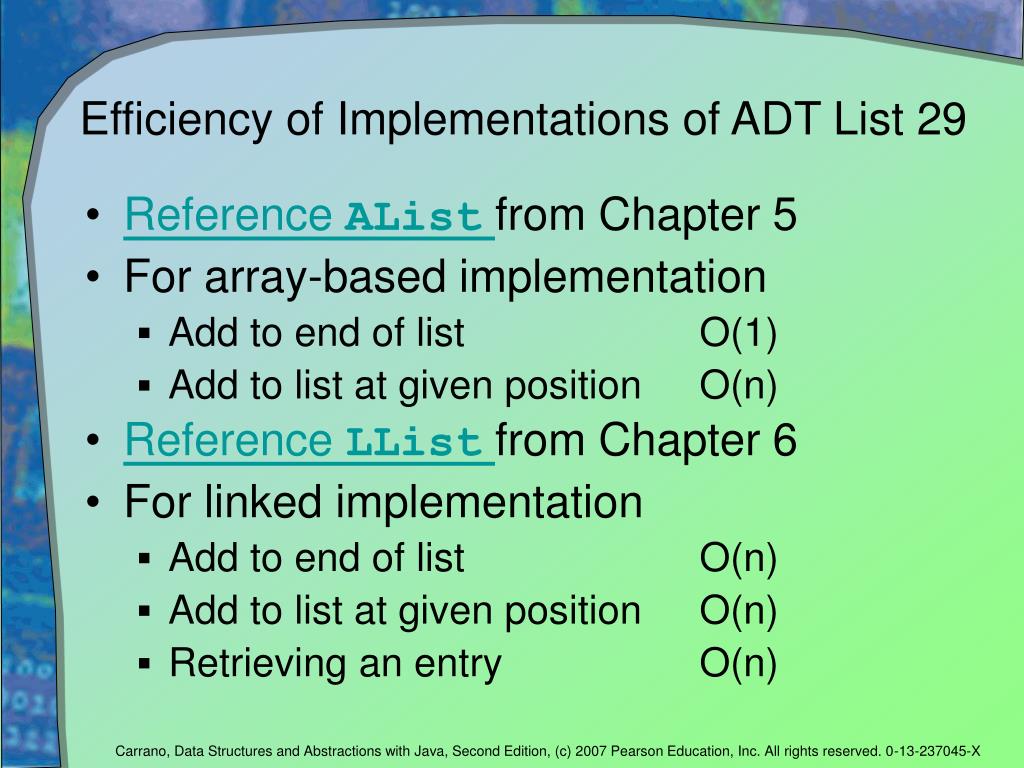 Efficiency of Implementations of ADT List 29 • Reference AListfrom Chapter 5 • For array-based implementation • Add to end of list O(1) • Add to list at given position O(n) • Reference LListfrom Chapter 6 • For linked implementation • Add to end of list O(n) • Add to list at given position O(n) • Retrieving an entry O(n) Carrano, Data Structures and Abstractions with Java, Second Edition, (c) 2007 Pearson Education, Inc. All rights reserved. 0-13-237045-X