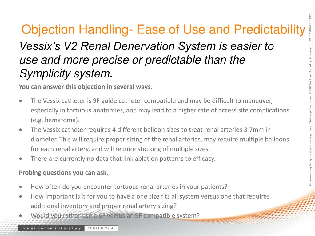 Objection Handling- Speed Vessix’s V2 Renal Denervation System is faster than the Symplicity system. • You can answer this objection in several ways. • Vessixhas not presented any data on average procedure times from their REDUCE-HTN FIM study. There is also lack of long term data to support the feature of shorter ablation time with the V2 system. • The Vessix catheter requires 4 different balloon sizes to treat a range of renal arteries 3-7mm in diameter. This will require proper sizing of the renal arteries, may require multiple balloons for each renal artery, and will require stocking of multiple sizes, potentially adding to the total procedure time for each case. • The Vessix catheter is 9F guide catheter compatible and may be difficult to maneuver, especially in tortuous anatomies, and may lead to higher access site complications (e.g. hematoma). • The ability to carefully select appropriate treatment spots with the Symplicity™ catheter is of enormous benefit in the tortuous anatomies encountered in daily practice. • Probing question you can ask. • Have you considered the total procedure time including setup of the system, access, and positioning of the catheter, especially in tortuous anatomy?