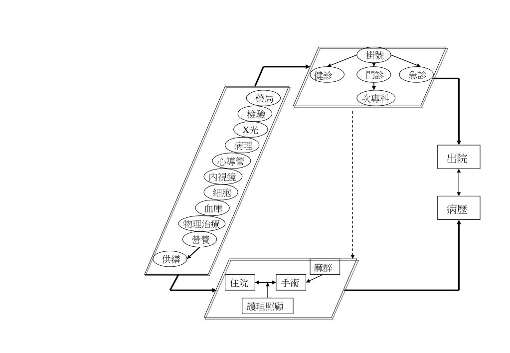 掛號 門診 急診 健診 藥局 次專科 檢驗 X光 病理 出院 心導管 內視鏡 細胞 血庫 病歷 物理治療 營養 供繕 麻醉 住院 手術 護理照顧