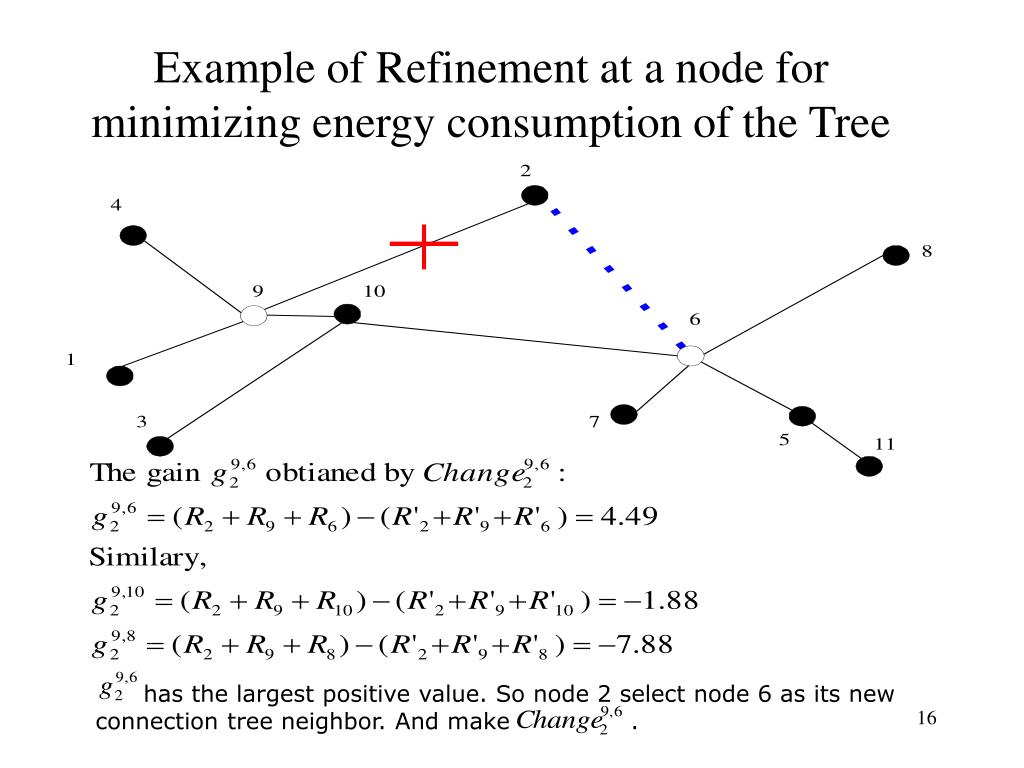 has the largest positive value. So node 2 select node 6 as its new connection tree neighbor. And make . Example of Refinement at a node for minimizing energy consumption of the Tree