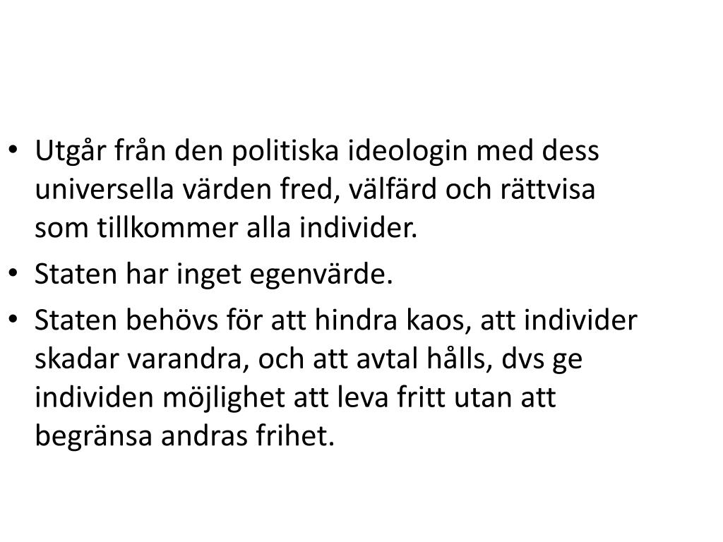 Utgår från den politiska ideologin med dess universella värden fred, välfärd och rättvisa som tillkommer alla individer. Staten har inget egenvärde. Staten behövs för att hindra kaos, att individer skadar varandra, och att avtal hålls, dvs ge individen möjlighet att leva fritt utan att begränsa andras frihet.
