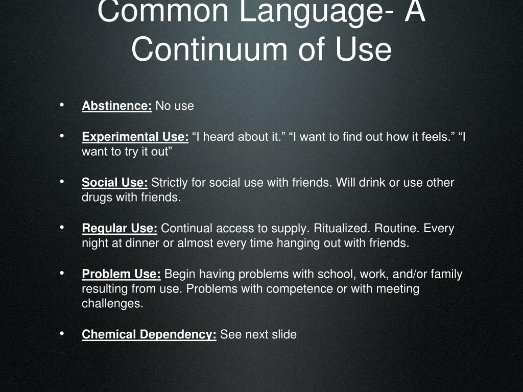 Common Language- A Continuum of Use • Abstinence • Experimental Use • Social Use • Regular Use • Problem Use • Chemical Dependency