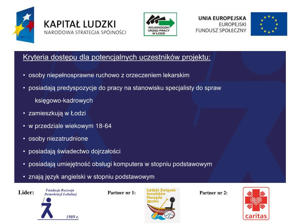 Kryteria dostępu dla potencjalnych uczestników projektu: • osoby niepełnosprawne ruchowo z orzeczeniem lekarskim • posiadają predyspozycje do pracy na stanowisku specjalisty do spraw księgowo-kadrowych • zamieszkują w Łodzi • w przedziale wiekowym 18-64 • osoby niezatrudnione • posiadają świadectwo dojrzałości • posiadają umiejętność obsługi komputera w stopniu podstawowym • znają język angielski w stopniu podstawowym