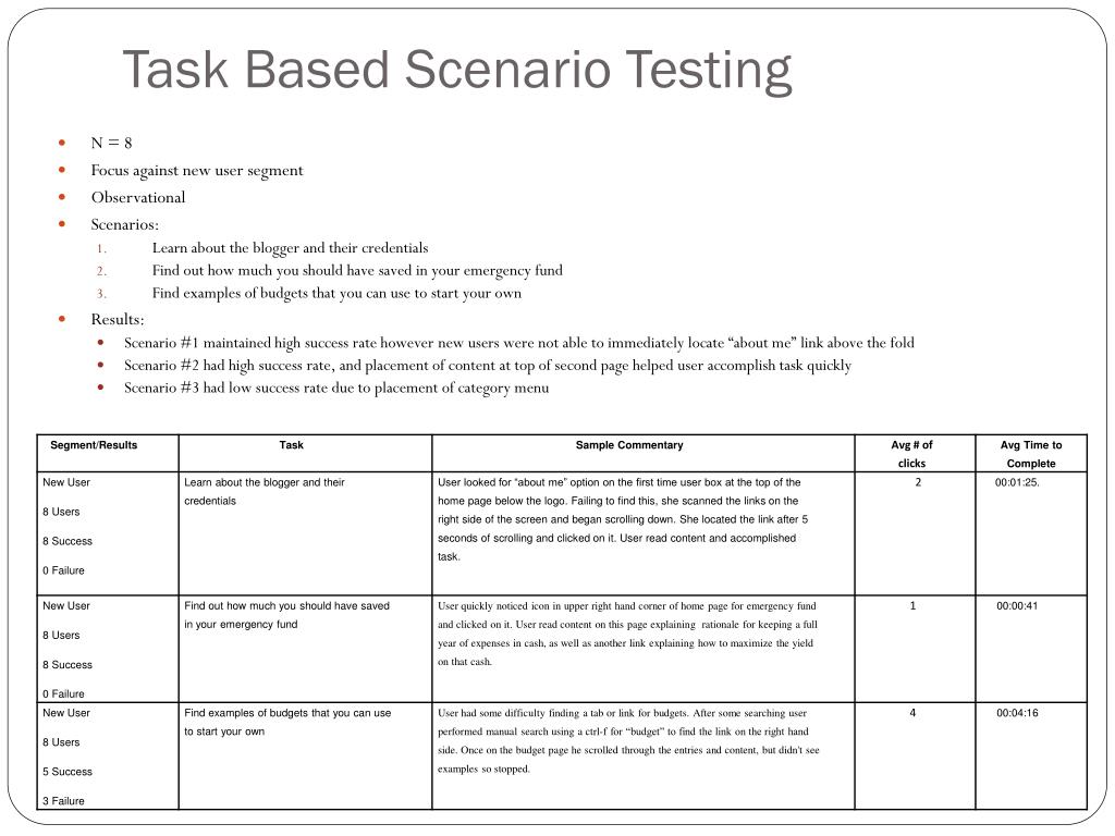 Task Based Scenario Testing • N = 8 • Focus against new user segment • Observational • Scenarios: • Learn about the blogger and their credentials • Find out how much you should have saved in your emergency fund • Find examples of budgets that you can use to start your own • Results: • Scenario #1 maintained high success rate however new users were not able to immediately locate “about me” link above the fold • Scenario #2 had high success rate, and placement of content at top of second page helped user accomplish task quickly • Scenario #3 had low success rate due to placement of category menu