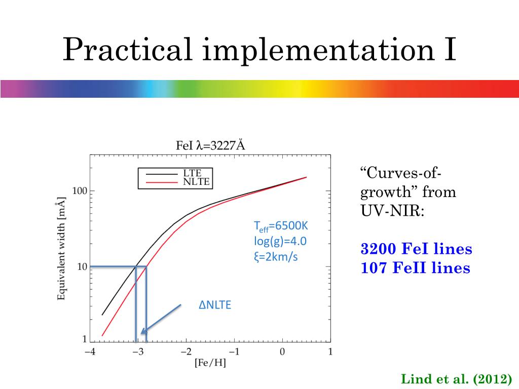 Practical implementation I “Curves-of-growth” from UV-NIR: 3200 FeI lines 107FeII lines Teff=6500K log(g)=4.0 ξ=2km/s ΔNLTE Lind et al. (2012)