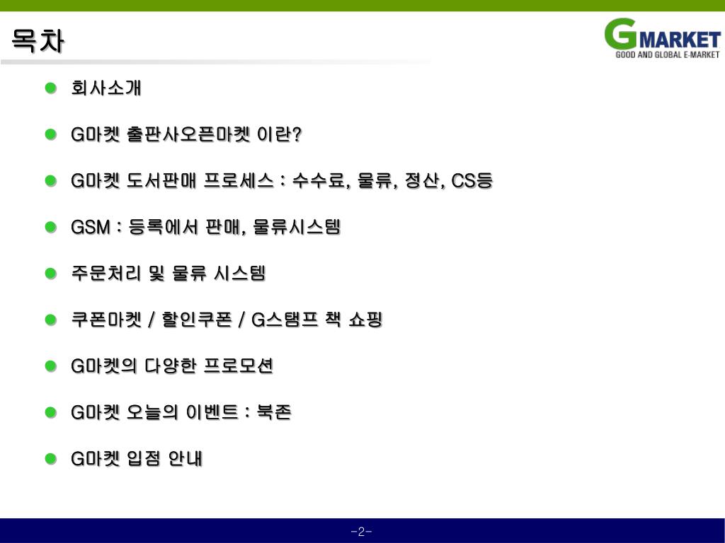 목차 • 회사소개 • G마켓 출판사오픈마켓 이란? • G마켓 도서판매 프로세스 : 수수료, 물류, 정산, CS등 • GSM : 등록에서 판매, 물류시스템 • 주문처리 및 물류 시스템 • 쿠폰마켓 / 할인쿠폰 / G스탬프 책 쇼핑 • G마켓의 다양한 프로모션 • G마켓 오늘의 이벤트 : 북존 • G마켓 입점 안내