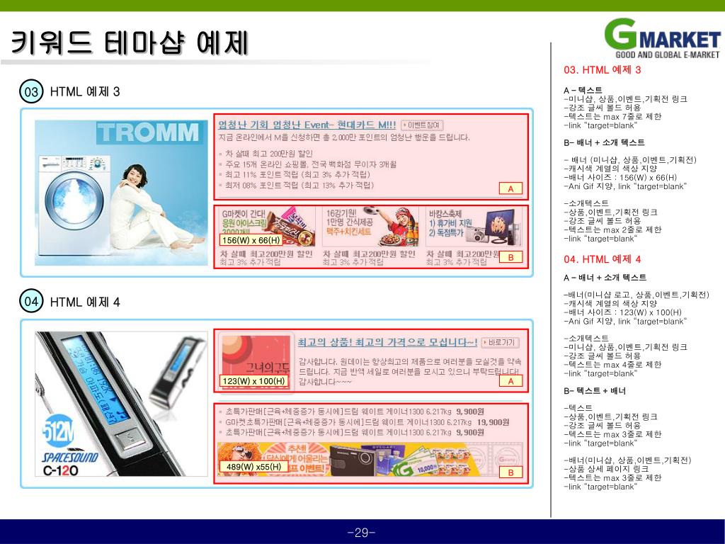 03 HTML 예제 3 A 156(W) x 66(H) B 04 HTML 예제 4 123(W) x 100(H) A 489(W) x55(H) B 키워드 테마샵 예제 • 03. HTML 예제 3 • A – 텍스트 • -미니샵, 상품,이벤트,기획전 링크 • -강조 글씨 볼드 허용 • -텍스트는 max 7줄로 제한 • -link “target=blank“ • B- 배너 + 소개 텍스트 • - 배너 (미니샵, 상품,이벤트,기획전) • 캐시색 계열의 색상 지양 • -배너 사이즈 : 156(W) x 66(H) • -Ani Gif 지양, link “target=blank“ • -소개텍스트 • -상품,이벤트,기획전 링크 • -강조 글씨 볼드 허용 • -텍스트는 max 2줄로 제한 • -link “target=blank“ • 04. HTML 예제 4 • A – 배너 + 소개 텍스트 • –배너(미니샵 로고, 상품,이벤트,기획전) • 캐시색 계열의 색상 지양 • -배너 사이즈 : 123(W) x 100(H) • -Ani Gif 지양, link “target=blank“ • -소개텍스트 • -미니샵, 상품,이벤트,기획전 링크 • -강조 글씨 볼드 허용 • -텍스트는 max 4줄로 제한 • -link “target=blank“ • B- 텍스트 + 배너 • -텍스트 • -상품,이벤트,기획전 링크 • -강조 글씨 볼드 허용 • -텍스트는 max 3줄로 제한 • -link “target=blank“ • -배너(미니샵, 상품,이벤트,기획전) • -상품 상세 페이지 링크 • -텍스트는 max 3줄로 제한 • -link “target=blank“