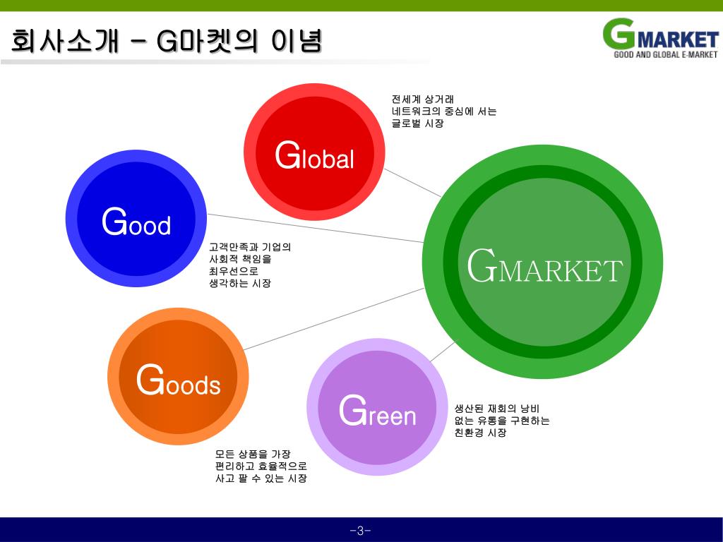 Global Good GMARKET Goods Green 회사소개 - G마켓의 이념 전세계 상거래 네트워크의 중심에 서는 글로벌 시장 고객만족과 기업의 사회적 책임을 최우선으로 생각하는 시장 생산된 재회의 낭비 없는 유통을 구현하는 친환경 시장 모든 상품을 가장 편리하고 효율적으로 사고 팔 수 있는 시장