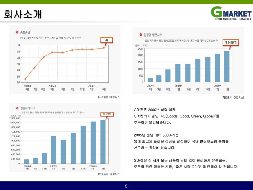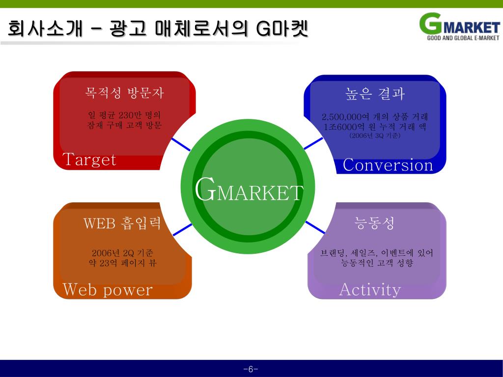 목적성 방문자 일 평균 230만 명의 잠재 구매 고객 방문 높은 결과 2,500,000여 개의 상품 거래1조6000억 원 누적 거래 액 (2006년 3Q 기준) GMARKET Target Conversion WEB 흡입력 2006년 2Q 기준 약 23억 페이지 뷰 능동성 브랜딩, 세일즈, 이벤트에 있어 능동적인 고객 성향 Web power Activity 회사소개 - 광고 매체로서의 G마켓
