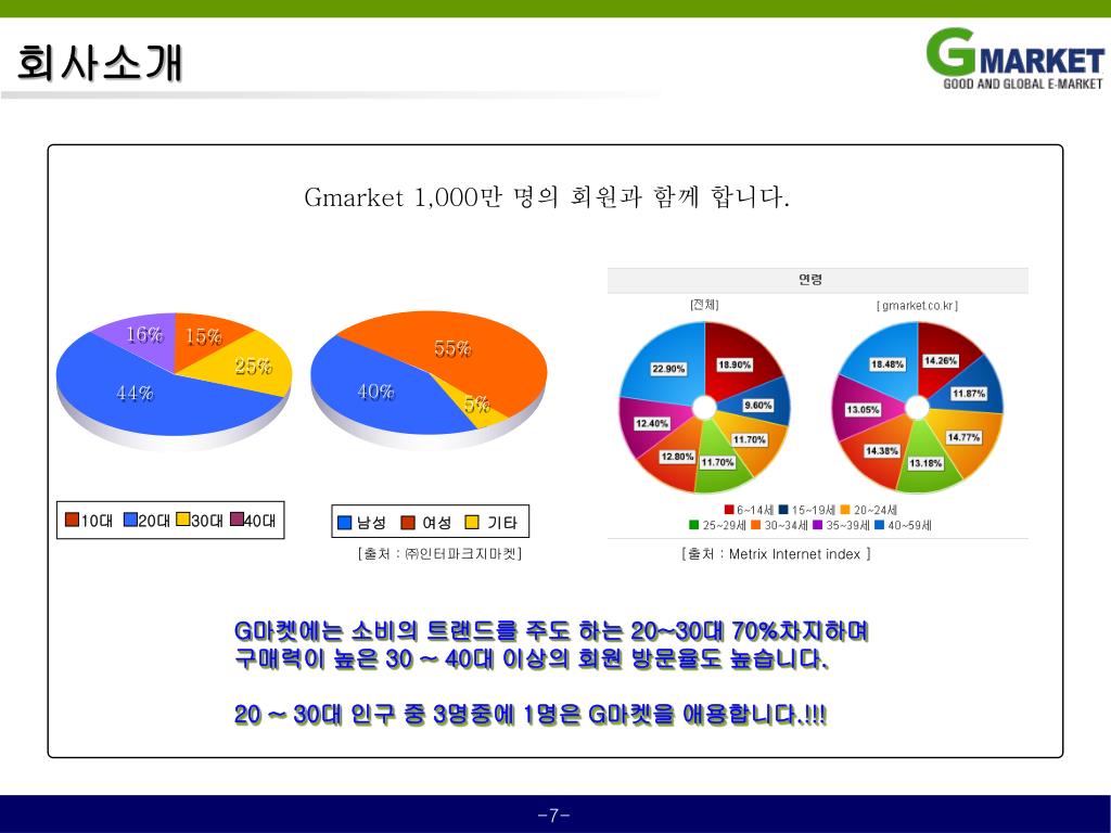 회사소개 Gmarket 1,000만 명의 회원과 함께 합니다. 16% 15% 55% 25% 40% 44% 5% 10대 20대 30대 40대 남성 여성 기타 [출처 : ㈜인터파크지마켓] [출처 : Metrix Internet index ] G마켓에는 소비의 트랜드를 주도 하는 20~30대 70%차지하며 구매력이 높은 30 ~ 40대 이상의 회원 방문율도 높습니다. 20 ~ 30대 인구 중 3명중에 1명은 G마켓을 애용합니다.!!!