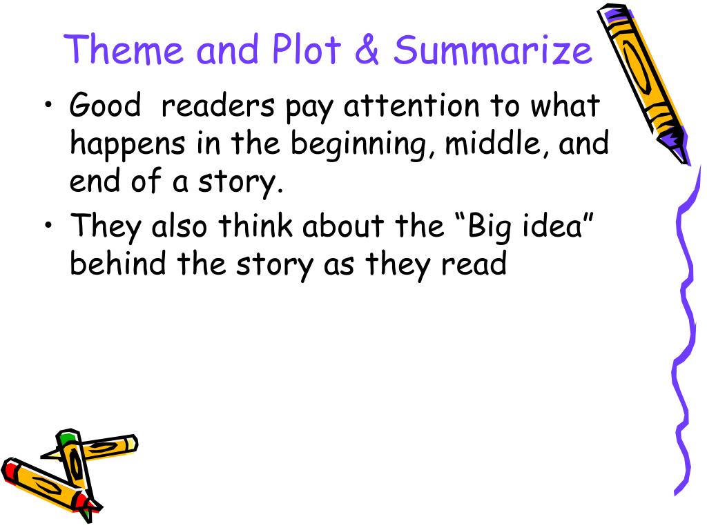 Theme and Plot & Summarize • Good readers pay attention to what happens in the beginning, middle, and end of a story. • They also think about the “Big idea” behind the story as they read