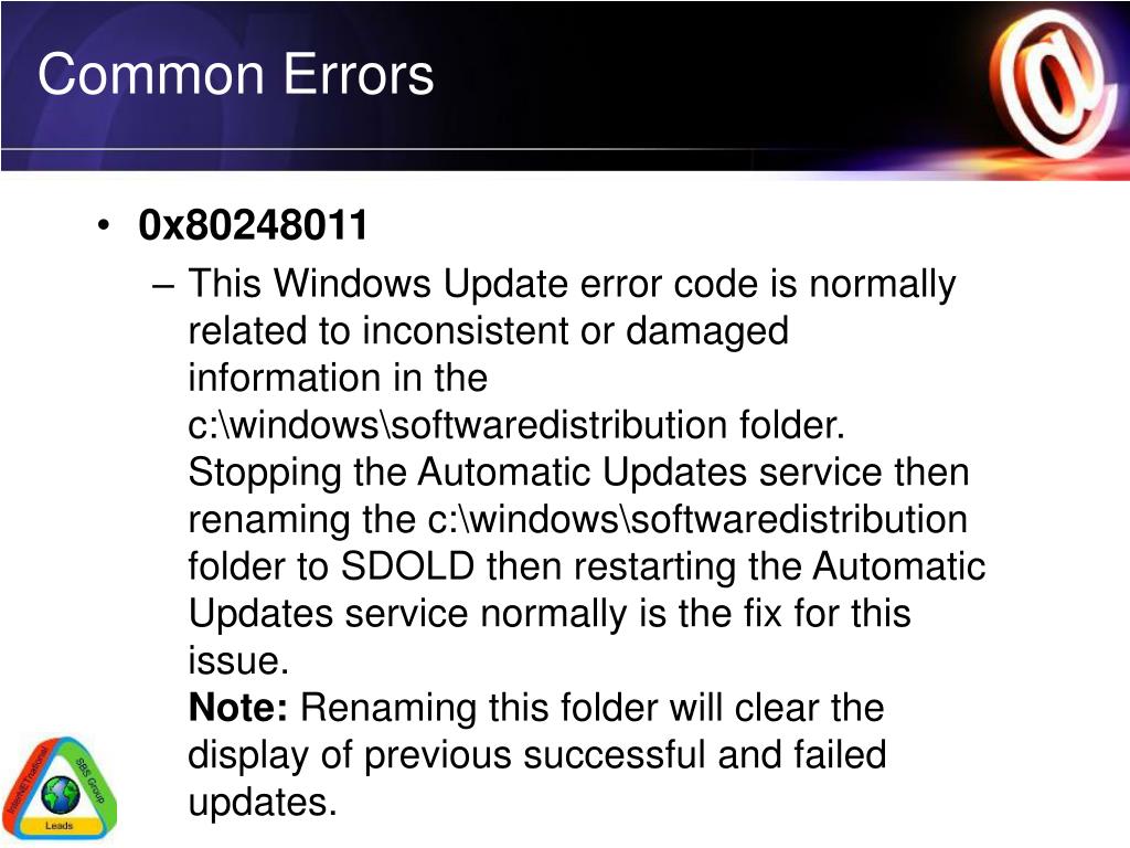 Common Errors • 0x80248011 • This Windows Update error code is normally related to inconsistent or damaged information in the c:\windows\softwaredistribution folder. Stopping the Automatic Updates service then renaming the c:\windows\softwaredistribution folder to SDOLD then restarting the Automatic Updates service normally is the fix for this issue.Note: Renaming this folder will clear the display of previous successful and failed updates.