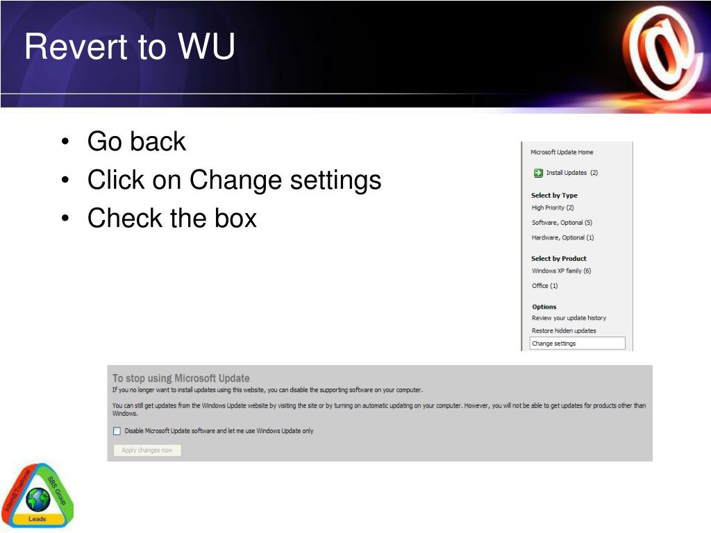 WU versus MU • Windows Update • Just patches Windows • http://update.microsoft.com/windowsupdate • Microsoft update • http://update.microsoft.com/microsoftupdate • Patches [at this time] • Windows • Office • Exchange • More to come • Engine is the same - Troubleshoot the same