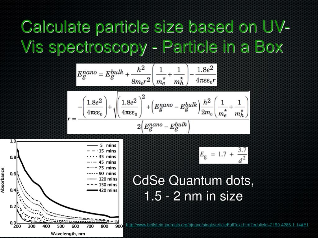 Calculate particle size based on UV-Vis spectroscopy - Particle in a Box CdSe Quantum dots, 1.5 - 2 nm in size http://www.beilstein-journals.org/bjnano/single/articleFullText.htm?publicId=2190-4286-1-14#E1