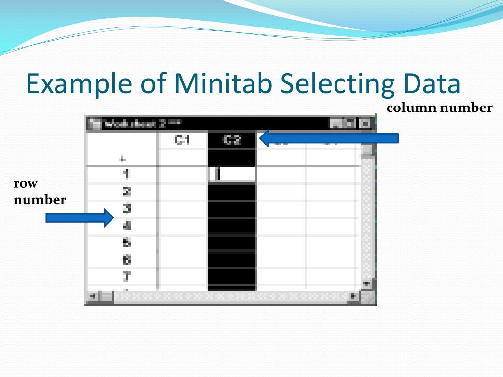 Minitab Instructions Covered • Manipulating Cells, Rows, and Columns • Selecting areas of the Data window • To select Do this • a block of cells drag across the cells. • one or more entire rows drag across the row numbers • one or more entire columns drag across the column numbers. • all the cells choose Edit , andSelect All Cells.
