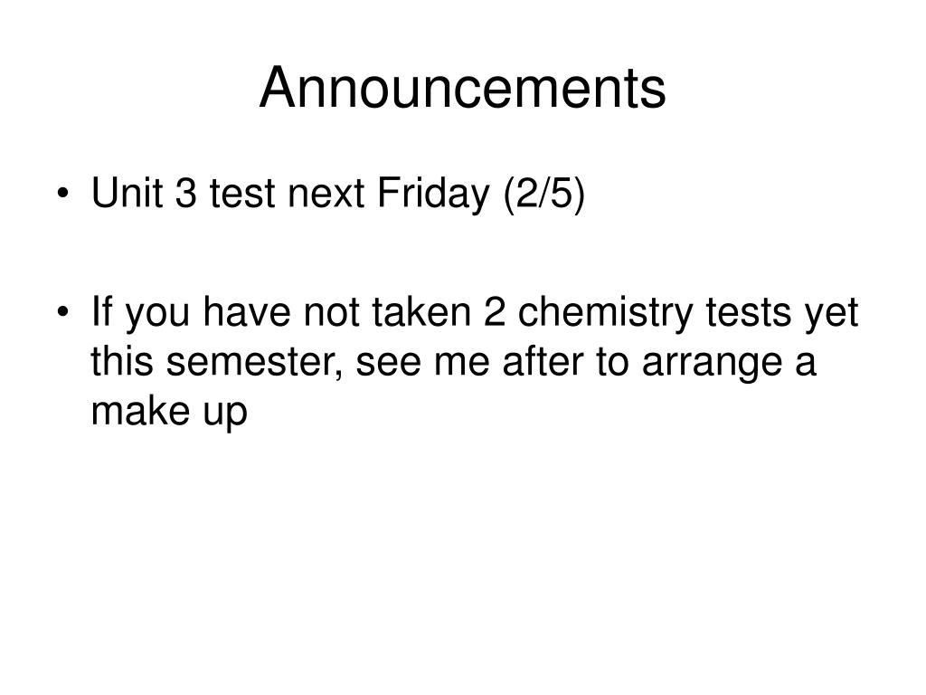 Announcements • Unit 3 test next Friday (2/5) • If you have not taken 2 chemistry tests yet this semester, see me after to arrange a make up