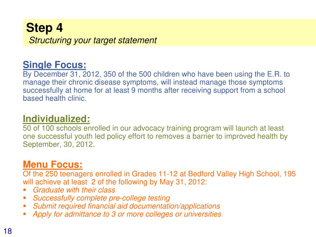 Step 4 Structuring your target statement • Single Focus: • By December 31, 2012, 350 of the 500 children who have been using the E.R. to manage their chronic disease symptoms, will instead manage those symptoms successfully at home for at least 9 months after receiving support from a school based health clinic. • Individualized: • 50 of 100 schools enrolled in our advocacy training program will launch at least one successful youth led policy effort to removes a barrier to improved health by September, 30, 2012. • Menu Focus: • Of the 250 teenagers enrolled in Grades 11-12 at Bedford Valley High School,195 will achieve at least 2 of the following by May 31, 2012: • Graduate with their class • Successfully complete pre-college testing • Submit required financial aid documentation/applications • Apply for admittance to 3 or more colleges or universities