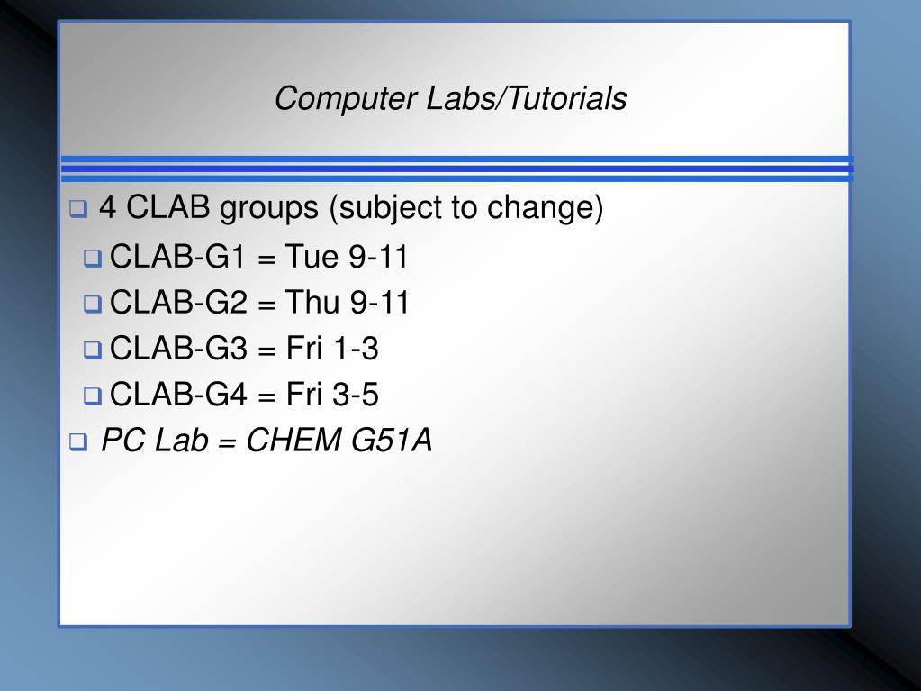 4 CLAB groups (subject to change) CLAB-G1 = Tue 9-11 CLAB-G2 = Thu 9-11 CLAB-G3 = Fri 1-3 CLAB-G4 = Fri 3-5 PC Lab = CHEM G51A Computer Labs/Tutorials
