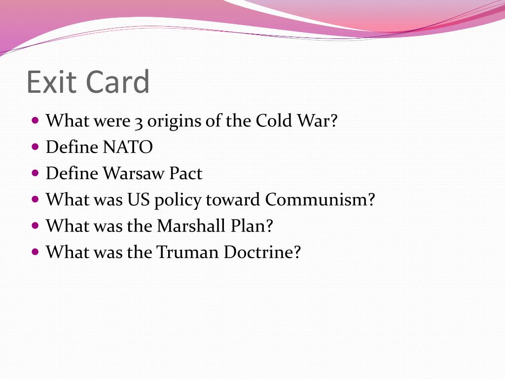 Exit Card • What were 3 origins of the Cold War? • Define NATO • Define Warsaw Pact • What was US policy toward Communism? • What was the Marshall Plan? • What was the Truman Doctrine?