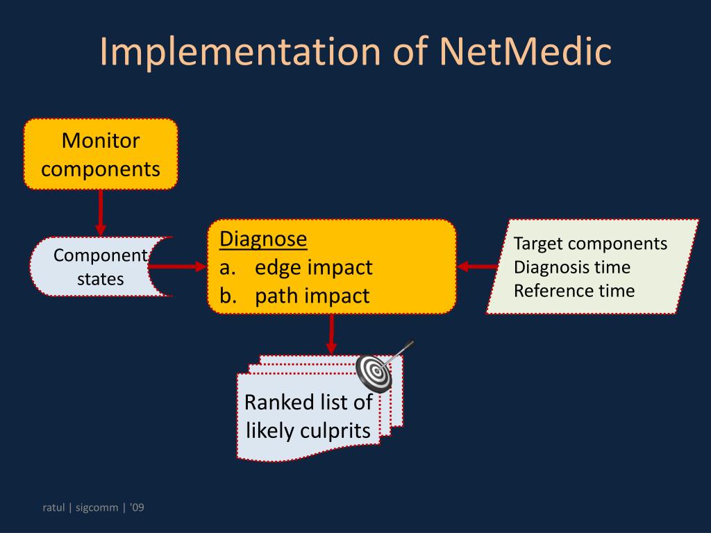 Implementation of NetMedic Monitor components Diagnose edge impact path impact Target components Diagnosis time Reference time Component states Ranked list of likely culprits