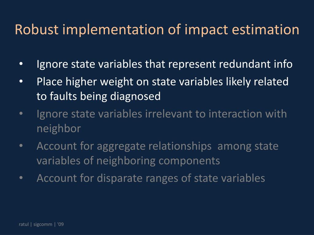 Robust implementation of impact estimation • Ignore state variables that represent redundant info • Place higher weight on state variables likely related to faults being diagnosed • Ignore state variables irrelevant to interaction with neighbor • Account for aggregate relationships among state variables of neighboring components • Account for disparate ranges of state variables