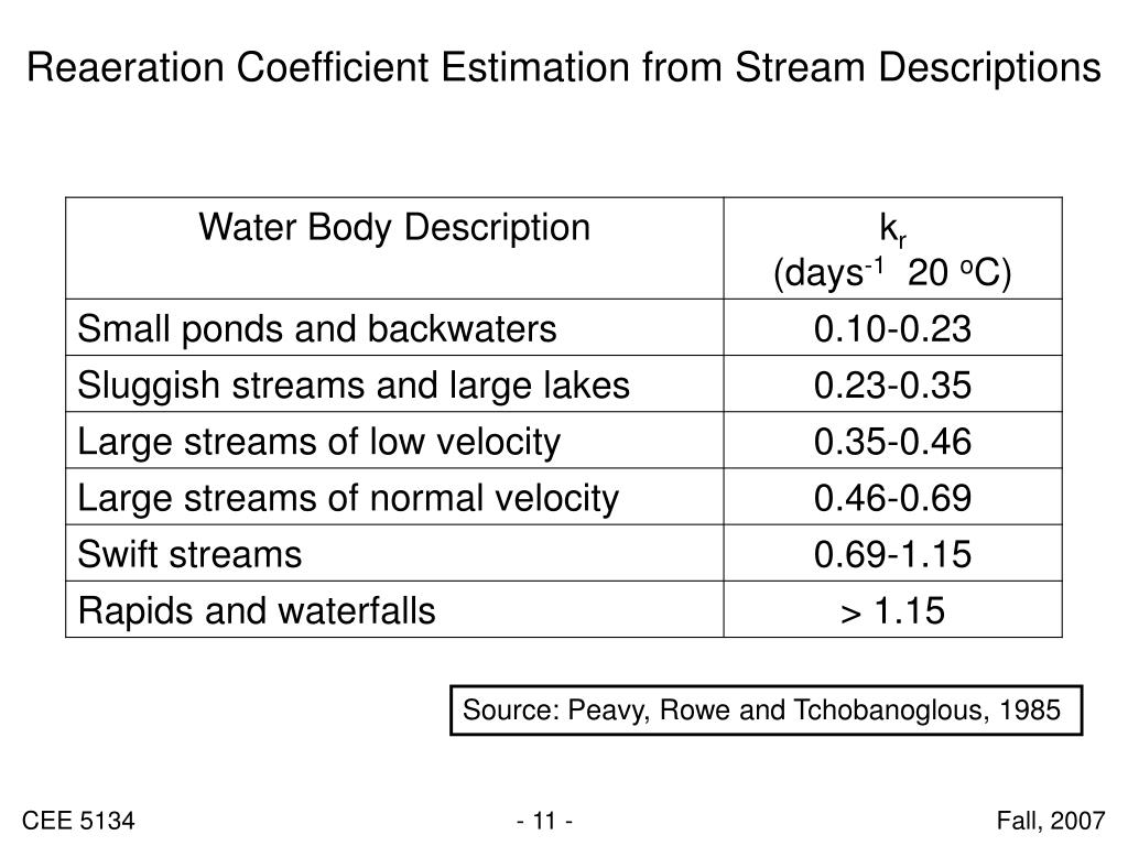 Reaeration Coefficient Estimation from Stream Descriptions Source: Peavy, Rowe and Tchobanoglous, 1985 CEE 5134 - 11 - Fall, 2007