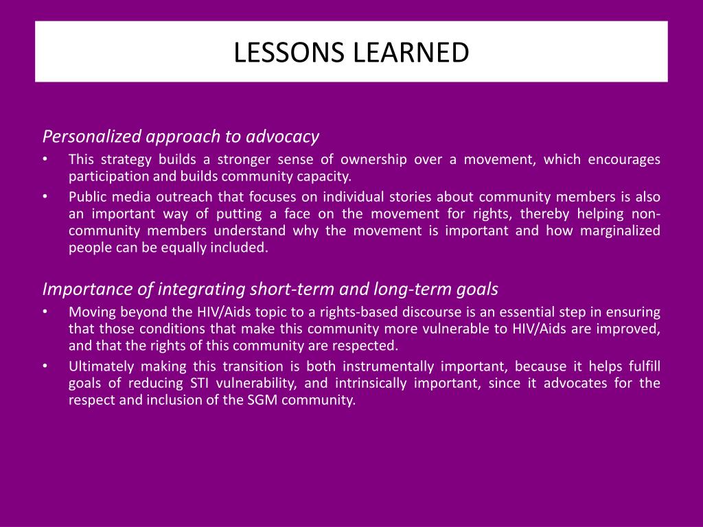 LESSONS LEARNED Personalized approach to advocacy • This strategy builds a stronger sense of ownership over a movement, which encourages participation and builds community capacity. • Public media outreach that focuses on individual stories about community members is also an important way of putting a face on the movement for rights, thereby helping non-community members understand why the movement is important and how marginalized people can be equally included. Importance of integrating short-term and long-term goals • Moving beyond the HIV/Aids topic to a rights-based discourse is an essential step in ensuring that those conditions that make this community more vulnerable to HIV/Aids are improved, and that the rights of this community are respected. • Ultimately making this transition is both instrumentally important, because it helps fulfill goals of reducing STI vulnerability, and intrinsically important, since it advocates for the respect and inclusion of the SGM community.