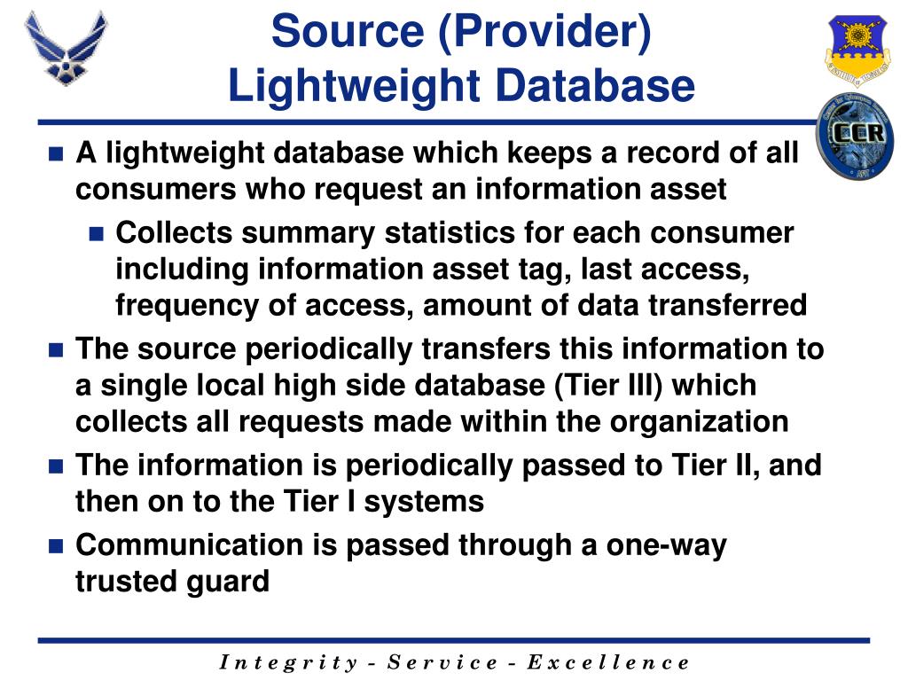 Source (Provider) Lightweight Database • A lightweight database which keeps a record of all consumers who request an information asset • Collects summary statistics for each consumer including information asset tag, last access, frequency of access, amount of data transferred • The source periodically transfers this information to a single local high side database (Tier III) which collects all requests made within the organization • The information is periodically passed to Tier II, and then on to the Tier I systems • Communication is passed through a one-way trusted guard