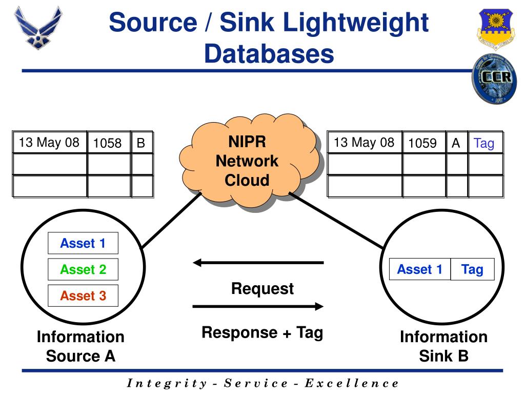 Source / Sink Lightweight Databases NIPR Network Cloud 13 May 08 13 May 08 1058 B 1059 A Tag Asset 1 Asset 1 Tag Asset 2 Request Asset 3 Response + Tag Information Source A Information Sink B