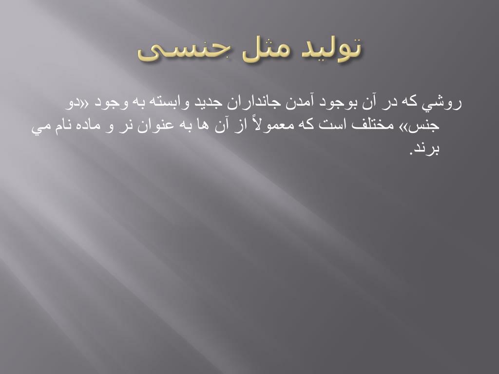 تولید مثل جنسی روشي كه در آن بوجود آمدن جانداران جديد وابسته به وجود «دو جنس» مختلف است كه معمولاً از آن ها به عنوان نر و ماده نام مي برند.