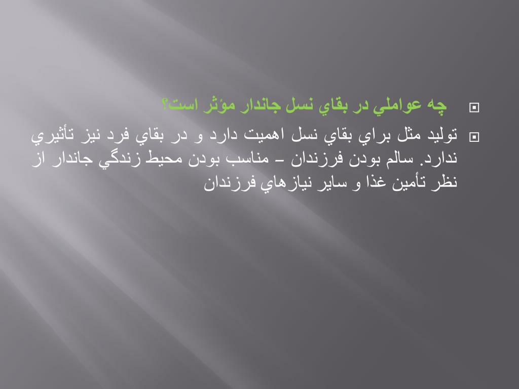 چه عواملي در بقاي نسل جاندار مؤثر است؟ • توليد مثل براي بقاي نسل اهميت دارد و در بقاي فرد نيز تأثيري ندارد. سالم بودن فرزندان – مناسب بودن محيط زندگي جاندار از نظر تأمين غذا و ساير نيازهاي فرزندان