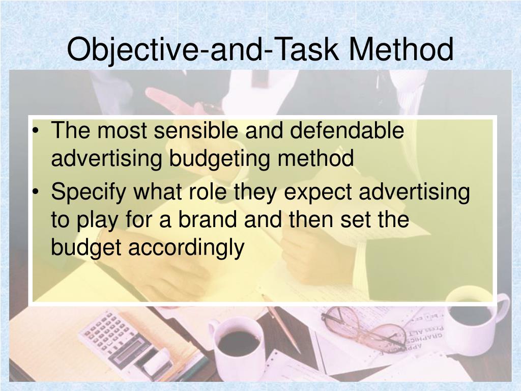 Objective-and-Task Method • The most sensible and defendable advertising budgeting method • Specify what role they expect advertising to play for a brand and then set the budget accordingly