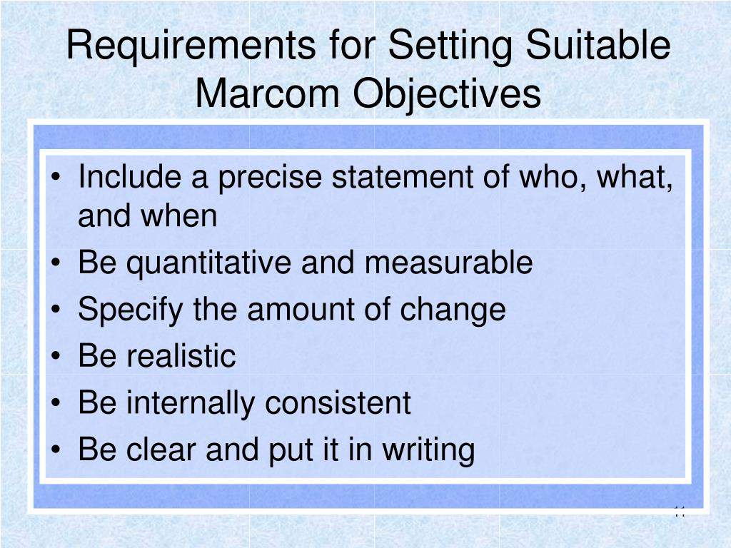 Requirements for Setting Suitable Marcom Objectives • Include a precise statement of who, what, and when • Be quantitative and measurable • Specify the amount of change • Be realistic • Be internally consistent • Be clear and put it in writing