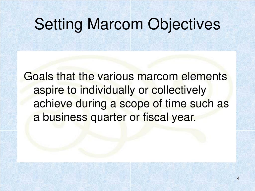 Setting Marcom Objectives Goals that the various marcom elements aspire to individually or collectively achieve during a scope of time such as a business quarter or fiscal year.