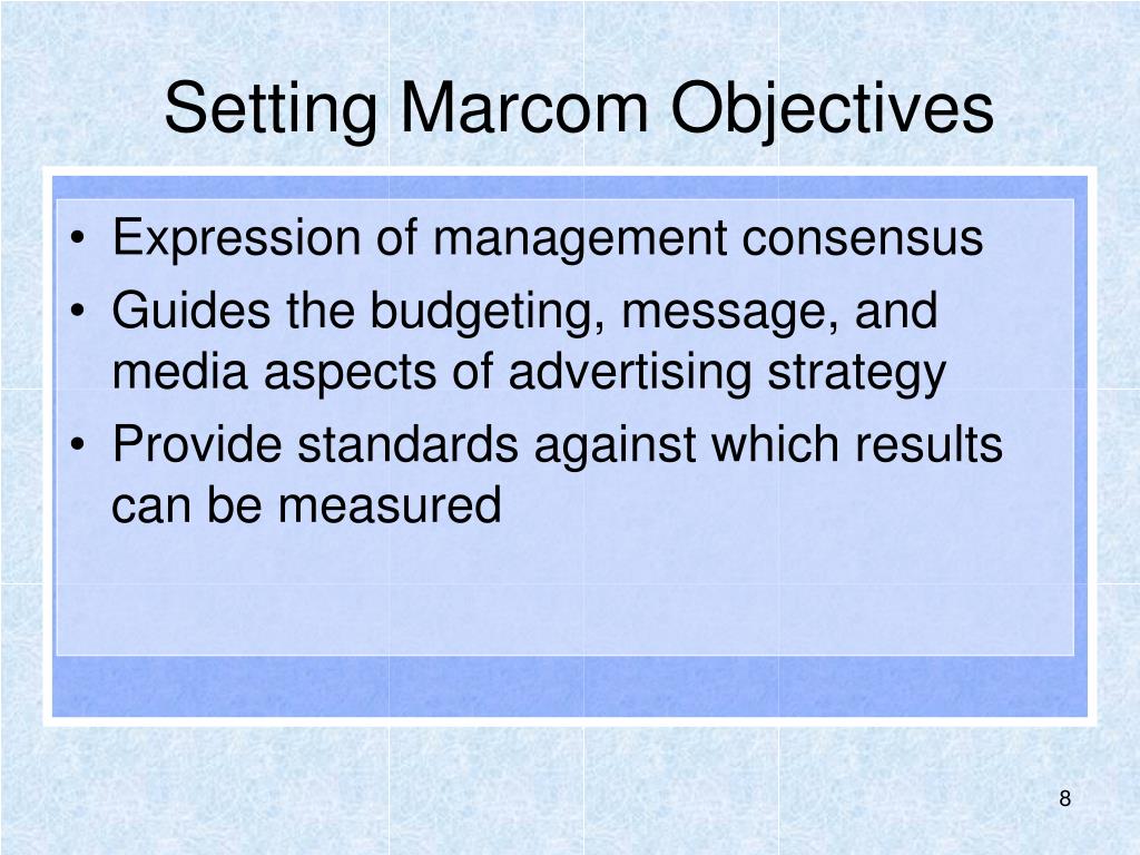 Setting Marcom Objectives • Expression of management consensus • Guides the budgeting, message, and media aspects of advertising strategy • Provide standards against which results can be measured