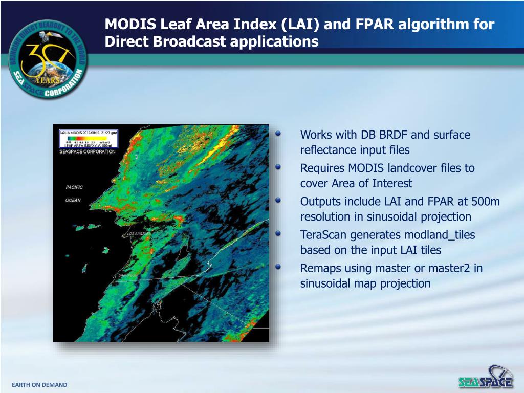 MODIS Leaf Area Index (LAI) and FPAR algorithm for Direct Broadcast applications • Works with DB BRDF and surface reflectance input files • Requires MODIS landcover files to cover Area of Interest • Outputs include LAI and FPAR at 500m resolution in sinusoidal projection • TeraScan generates modland_tiles based on the input LAI tiles • Remaps using master or master2 in sinusoidal map projection