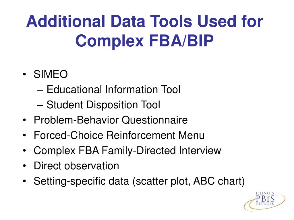Additional Data Tools Used for Complex FBA/BIP • SIMEO • Educational Information Tool • Student Disposition Tool • Problem-Behavior Questionnaire • Forced-Choice Reinforcement Menu • Complex FBA Family-Directed Interview • Direct observation • Setting-specific data (scatter plot, ABC chart)