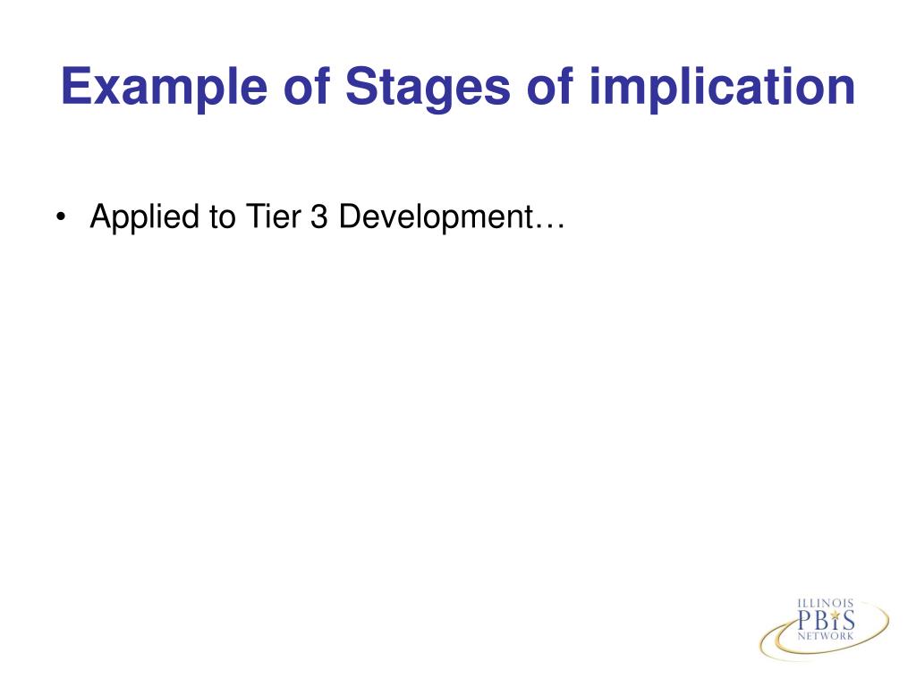 Innovation Stage: • District Leadership Team mtg. w. a Tertiary focus at least quarterly w. community & family representation • District Tertiary Coach 1 fte (fully funded) • 9 or more buildings with at least monthly Secondary Systems, Tertiary Systems & Problem Solving Team mtgs. • 9 or more buildings with 1-3 % of kids with 2 or more data points • Modified district policies/procedures • Specific strategies for blending related initiatives