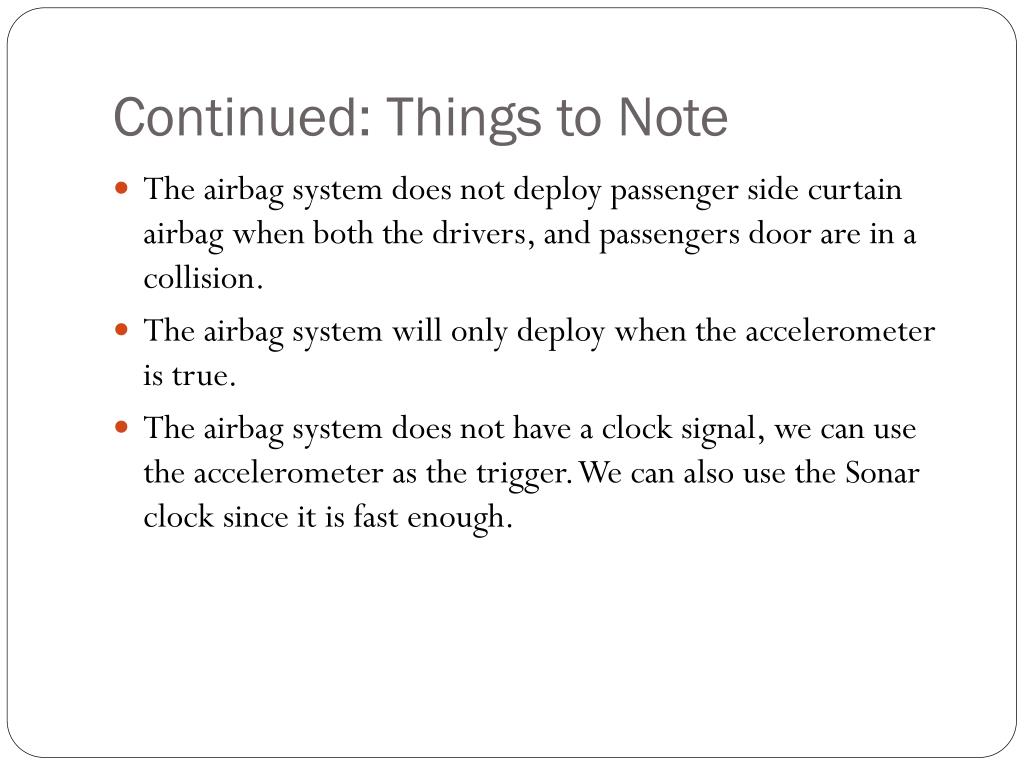 Continued: Things to Note • The airbag system does not deploy passenger side curtain airbag when both the drivers, and passengers door are in a collision. • The airbag system will only deploy when the accelerometer is true. • The airbag system does not have a clock signal, we can use the accelerometer as the trigger. We can also use the Sonar clock since it is fast enough.